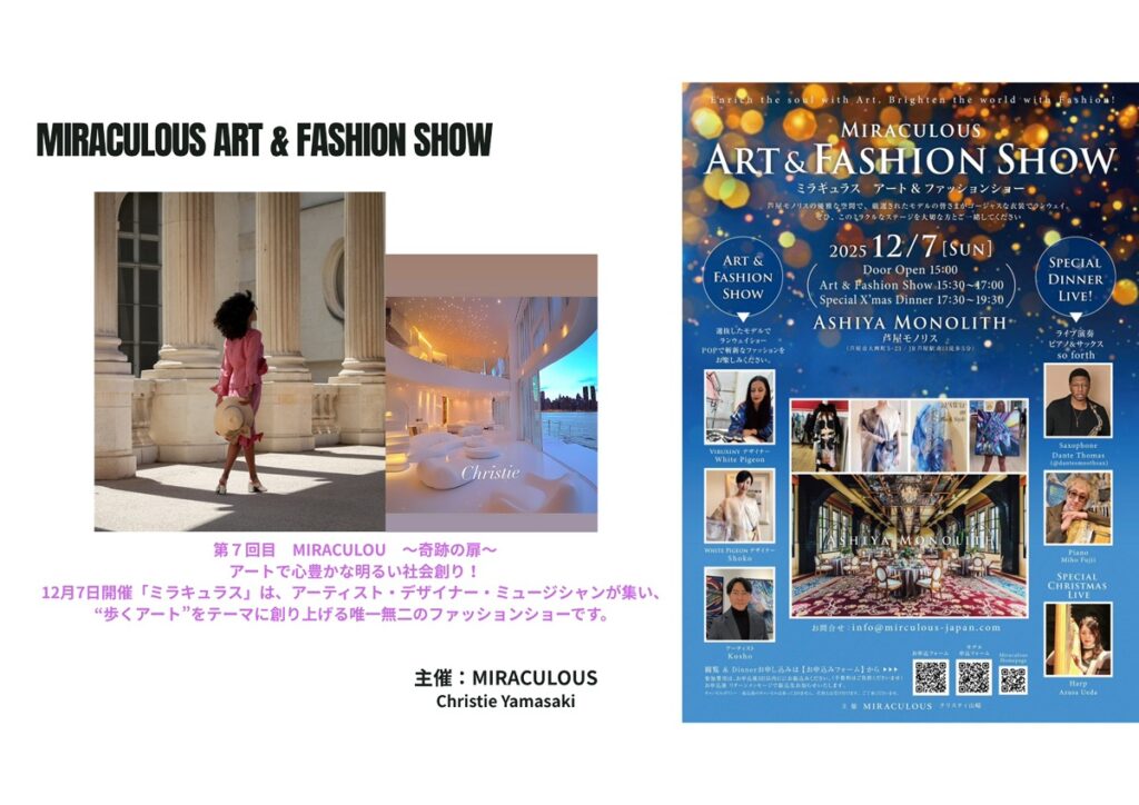 プレスリリース 第7回 MIRACULOUS ART & FASHION SHOW 「第7回 MIRACULOUS ART & FASHION SHOW」が、2025年12月7日(日)に芦屋モノリスにて開催されます。アート・ファッション・音楽が交差し、“光をまとうランウェイ”をテーマにしたイベントです。詳細は下記のプレスリリースをご覧ください。 プレスリリースはこちら Post Share Hatena Pocket Pin it イベントのお知らせ 前の記事