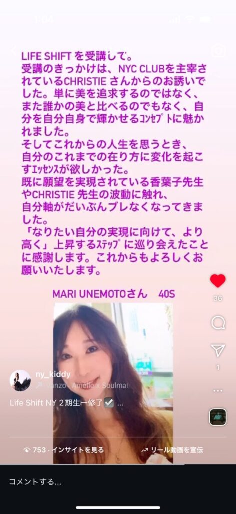 受講のきっかけは、NYC CLUBを主宰されているCHRISTIEさんからのお誘いでした。単に美を追求するのではなく、また誰かの美と比べるのでもなく、自分を自分自身で輝かせるコンセプトに魅かれました。